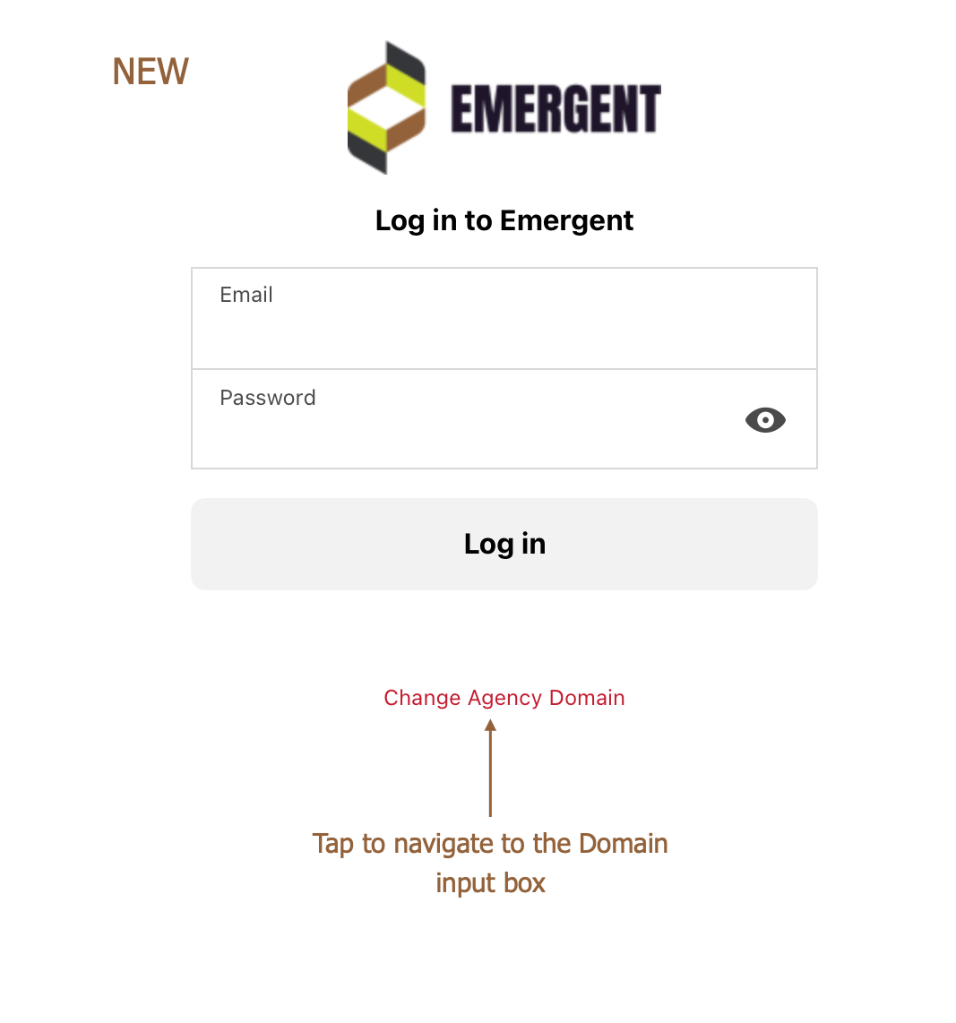 The Emergent App has been updated with a minor change to the UI layout on the login page. Users who have previously logged into the iPad will no longer see the domain input box on their login window. They will simply see the input boxes for their email and password.